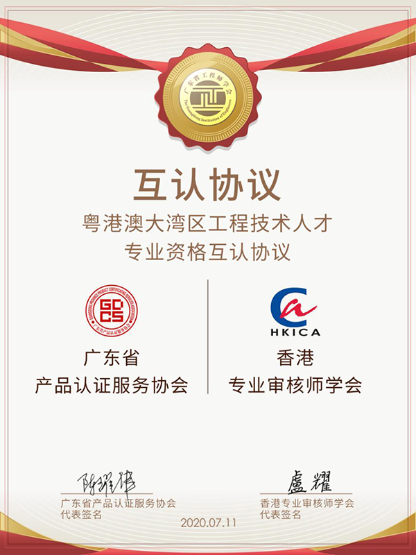 2020年7月,为加强内地和港澳质量管理工程技术人才的交流与合作,促进粤港澳大湾区的共同发展,广东省产品认证服务协会和香港专业审核师学会双方通过交流研究,一致认为广东省产品认证服务协会质量管理工程技术人才和香港专业审核师学会HKICA质量管理师在培训、评价标准等方面的实质内容上基本相同。经认证协会、香港学会协商,双方同意就广东省产品认证服务协会的质量管理工程师和香港专业审核师学会的质量管理师资格开展资格互认及合作开展粤港澳大湾区质量管理工程技术人才资格评价。